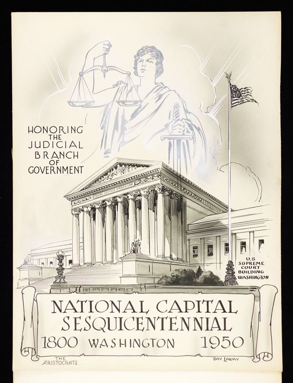 5366 991 imageDan Lowry, Original Cachet Production Art (991), 20" x 15" art board with unique pen and ink drawing used by The Aristocrats; very attractive oversized original illustration perfect for framing or as part of an exhibit of the National Capitol Sesquicentennial (Supreme Court) 3¢ Issue released in 1950, Very Fine. Shipping charges apply - weight 1 lbs. (Image) Suggested Bid $130