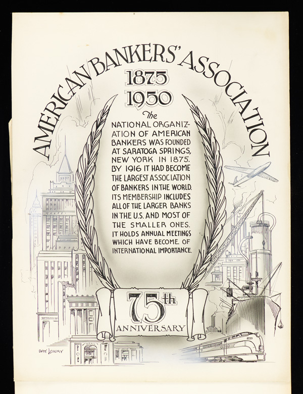 5365 987 imageDan Lowry, Original Cachet Production Art (987), 20" x 15" art board with unique pen and ink drawing used by The Aristocrats; very attractive oversized original illustration perfect for framing or as part of an exhibit of the American Bankers Association 3¢ Issue released in 1949. Shipping charges apply - weight 1 lbs. (Image) Suggested Bid $130