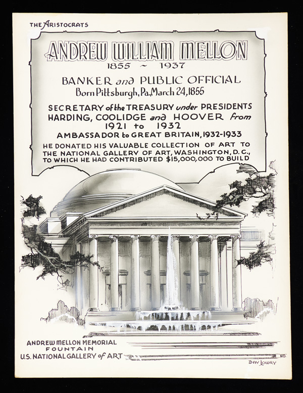 5378 1072 imageDan Lowry, Original Cachet Production Art (1072), 20" x 15" art board with unique pen and ink drawing used by The Aristocrats; very attractive oversized original illustration perfect for framing or as part of an exhibit of the Andrew W. Mellon 3¢ Issue released in 1955. Shipping charges apply - weight 0.8 lbs. (Image) Suggested Bid $130