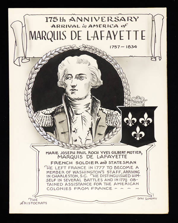 5383 1097 imageDan Lowry, Original Cachet Production Art (1097), 20" x 15" art board with unique pen and ink drawing used by The Aristocrats; very attractive oversized original illustration perfect for framing or as part of an exhibit of the Lafayette Bicentenary 3¢ Issue released in 1957. Shipping charges apply - weight 1 lbs. (Image) Suggested Bid $130
