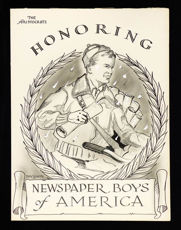 5373 1015 imageDan Lowry, Original Cachet Production Art (1015), 20" x 15" art board with unique pen and ink drawing used by The Aristocrats; very attractive oversized original illustration perfect for framing or as part of an exhibit of the Newspaper Boys 3¢ Issue released in 1952. Shipping charges apply - weight 1 lbs. (Image) Suggested Bid $130