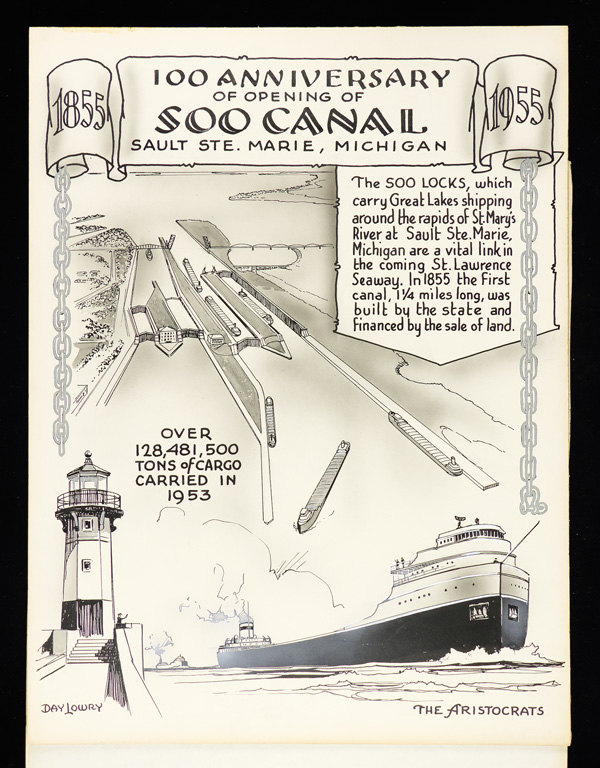 5376 1069 imageDan Lowry, Original Cachet Production Art (1069), 20" x 15" art board with unique pen and ink drawing used by The Aristocrats; very attractive oversized original illustration perfect for framing or as part of an exhibit of the Soo Locks 3¢ Issue released in 1955. Shipping charges apply - weight 1.4 lbs. (Image) Suggested Bid $130