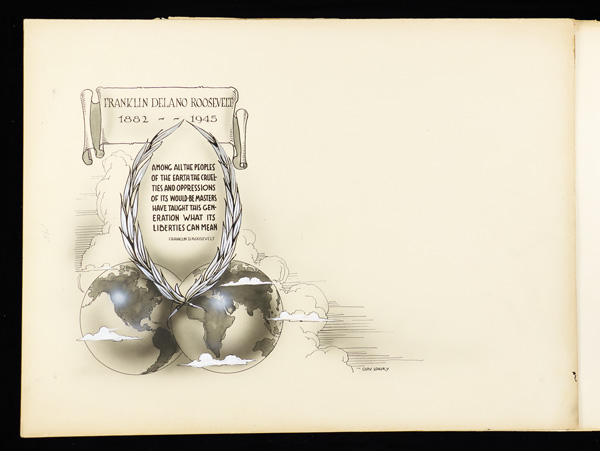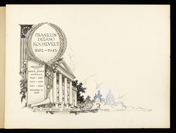 5362 932 imageDan Lowry, Original Cachet Production Art (932), 20" x 15" art board with unique pen and ink drawing used by The Aristocrats; very attractive oversized original illustration perfect for framing or as part of an exhibit of the Franklin D. Roosevelt 3¢ Issue released in 1945. Shipping charges apply - weight 1 lbs. (Image) Suggested Bid $130