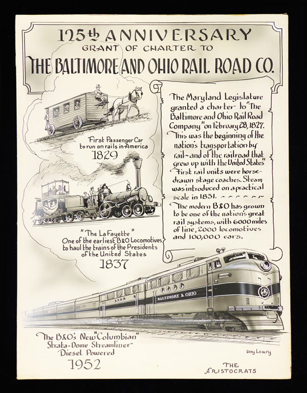 5370 1006 imageDan Lowry, Original Cachet Production Art (1006), 20" x 15" art board with unique pen and ink drawing used by The Aristocrats; very attractive oversized original illustration perfect for framing or as part of an exhibit of the B & O Railroad 3¢ Issue released in 1952. Shipping charges apply - weight 1 lbs. (Image) Suggested Bid $130