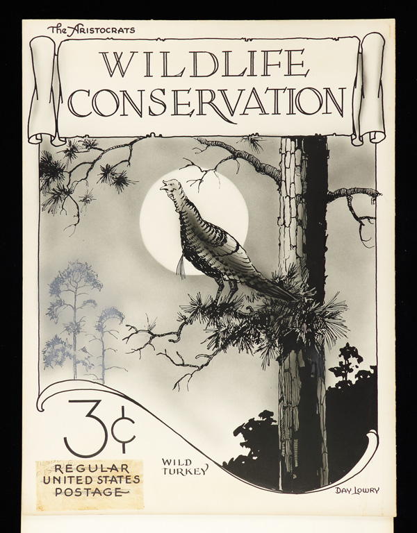 5380 1077 imageDan Lowry, Original Cachet Production Art (1077), 20" x 15" art board with unique pen and ink drawing used by The Aristocrats; very attractive oversized original illustration perfect for framing or as part of an exhibit of the Wild Turkey Conservation 3¢ Issue released in 1956. Shipping charges apply - weight 1.4 lbs. (Image) Suggested Bid $130