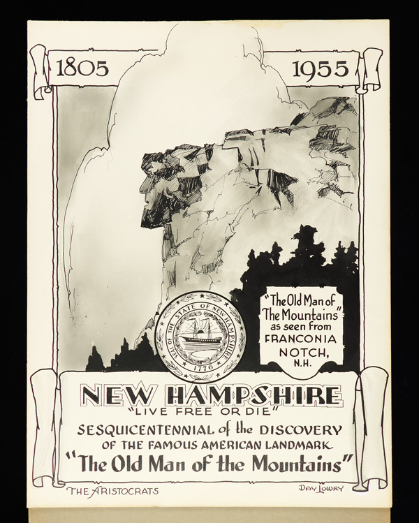 5375 1068 imageDan Lowry, Original Cachet Production Art (1068), 20" x 15" art board with unique pen and ink drawing used by The Aristocrats; very attractive oversized original illustration perfect for framing or as part of an exhibit of the New Hampshire 3¢ Issue released in 1955. Shipping charges apply - weight 1.2 lbs. (Image) Suggested Bid $130