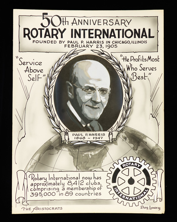 5374 1066 imageDan Lowry, Original Cachet Production Art (1066), 20" x 15" art board with unique pen and ink drawing used by The Aristocrats; very attractive oversized original illustration perfect for framing or as part of an exhibit of the Rotary International 8¢ Issue released in 1955. Shipping charges apply - weight 1 lbs. (Image) Suggested Bid $130