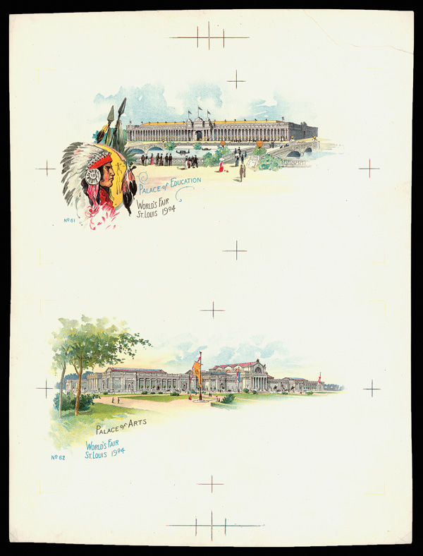 5389 Pcover   image1904, St. Louis World's Fair, proof of two Expo postcards, approximately 192 x 256mm sheet with multicolor designs for "Palace of Education" (No. 61, top) and "Palace of Arts" (No. 62, bottom) cards; lovely designs, the "Palace of Education" featuring a Native American in headdress, with fresh colors and printer's crosses for each; corners bumped or creased (particularly noticeable at top right) but well clear of designs; a lovely collateral item for your collection or exhibition. (Image) Suggested Bid $200