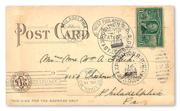 1904, 2¢ Louisiana Purchase on Souvenir Postcard with Annex Station Postmark (Scott 324), cancelled July 9, 1904;