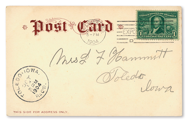 1904, 1¢ Louisiana Purchase on Postcard with Opened Period Hand Stamped Marking (Scott 323), features "ST. LOUIS, MO."