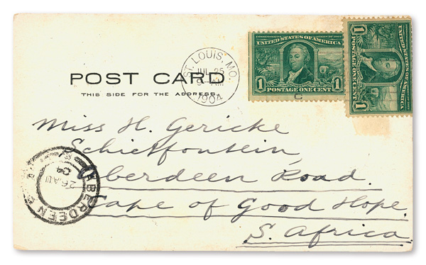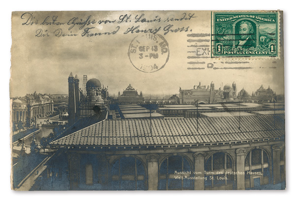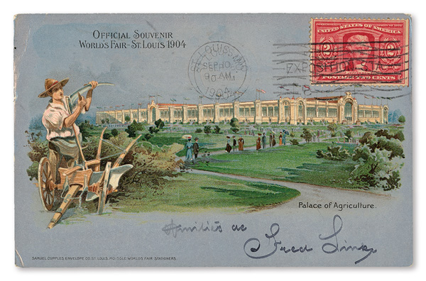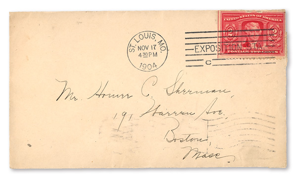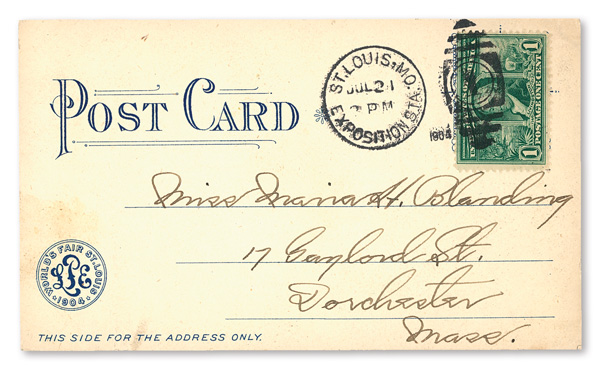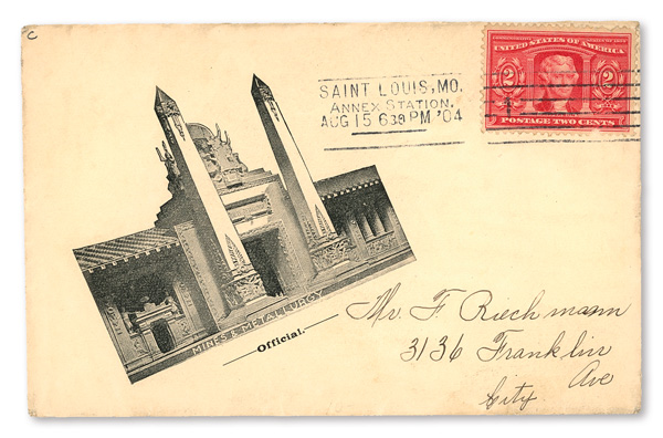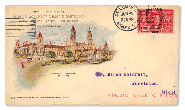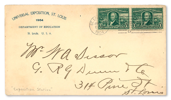 appropriate exhibition station cancel; sent from the Department of Education at the Exposition; addressed to St. Louis, Missouri.