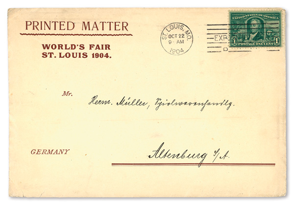 marked as containing printed matter from the World's Fair; addressed to Allenberg, Germany. (Image)