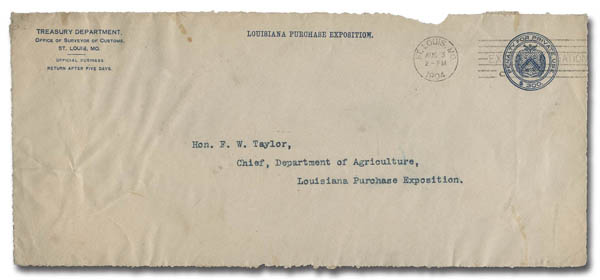 exhibition station cancel; sent from the Office of Surveyor of Customs to F.W. Taylor, Chief of the Department of Agriculture for the Louisiana Purchase Exposition; cover is a cut front only. (Image)
