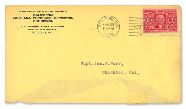 from California Louisiana Purchase Exposition Commission at the California State Building to Superintendent James A. Barr in Stockton, California.