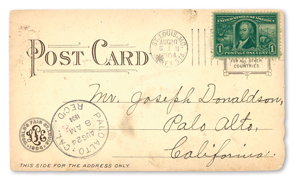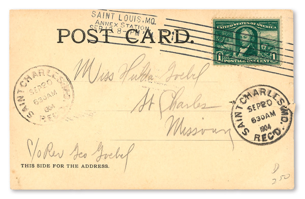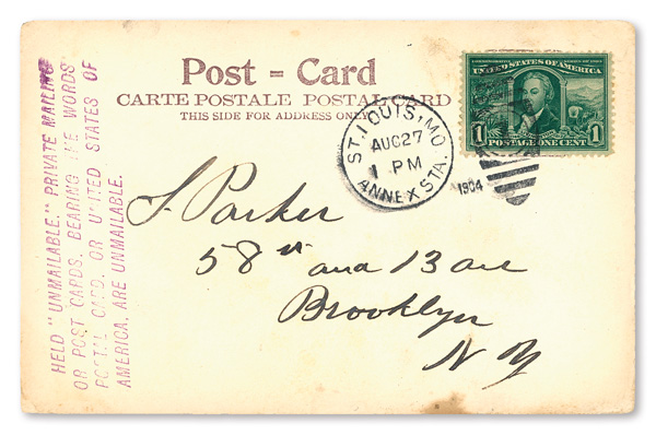 1904, 1¢ Louisiana Purchase on Postcard with Annex Station Postmark (Scott 323), cancelled August 20, 1904; S. Couples