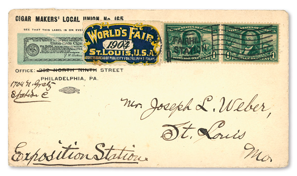 November 27, 1904; features one very nice promotional label on front as well as a Forestry and Mines cinderella stamp on the back; sent on Cigar Maker's Local Union No. 165 of Philadelphia advertising covers; addressed to St. Louis; an extremely