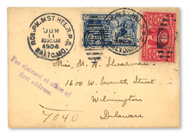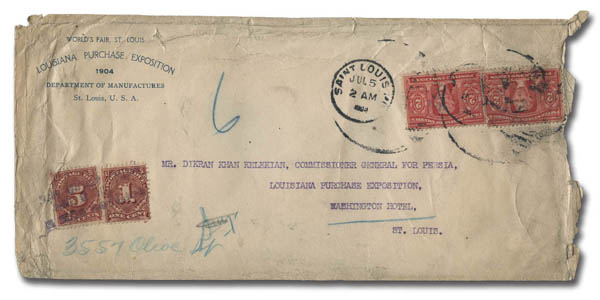1904; sent to Dikran Khan Kelekian, Commissioner General for Persia for the Exposition at the Washington Hotel in St. Louis; features 7¢ Postage Due; a desirable and intriguing cover. (Image)