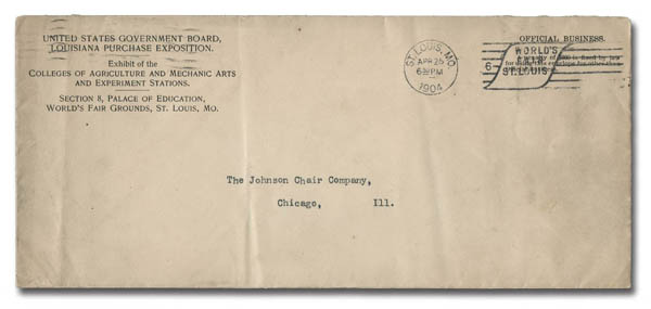 "Section 8, Palace of Education, World's Fair Grounds, St. Louis, MO." to the Johnson Chair Company of Chicago, Illinois; an attractive cover with appropriate Exhibition cancel. (Image)