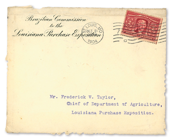 Grounds) (Scott 324), Cover sent from the "Brazilian Commission to the Louisiana Purchase Exposition" to Frederick W. Taylor, Chief of Department of Agriculture; cover is a cut front with some wear near top; nonetheless, an attractive and scarce