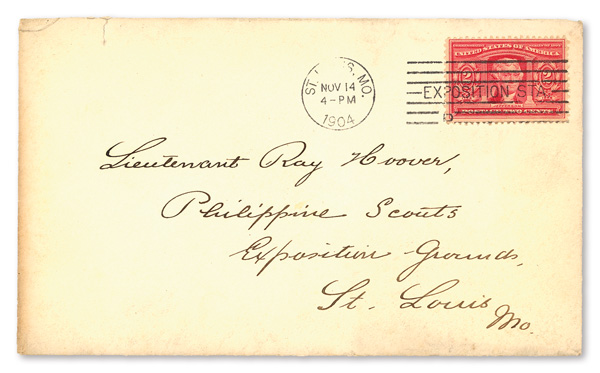 14, 1904; Cover sent to Lieutenant Ray Hoover of the Philippine Scouts posted at the Exposition; interestingly, Hoover would go missing a year later and never be found, with foul played suspected; a very unique cover with some unusual history behind