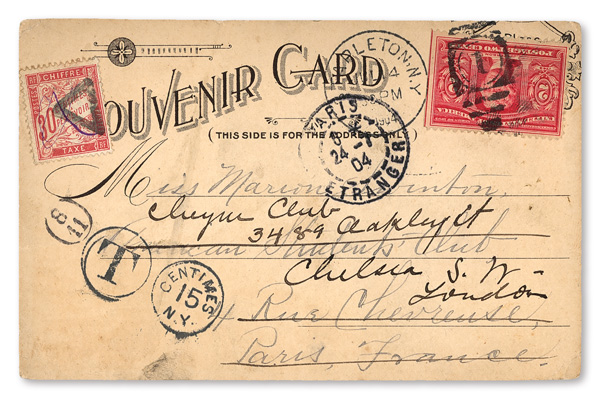 New York on July 14, 1904 to Paris, France, July 24, then forwarded to London, England with 30 centimes stamp added; features some light wear.