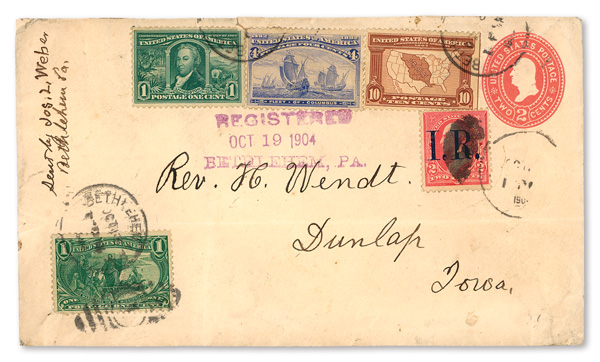 very attractive and unusual cover; sports six times the 2¢ letter rate and 8¢ registration fee in combination with the improper Revenue usage; additionally features a St. Louis Exposition label on back; sent from Bethlehem, Pennsylvania to