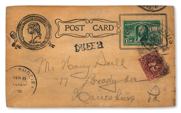 1904, 1¢ Louisiana Purchase with Postage Due on Wooden World's Fair Advertising Postcard (Scott 323, J38), a
