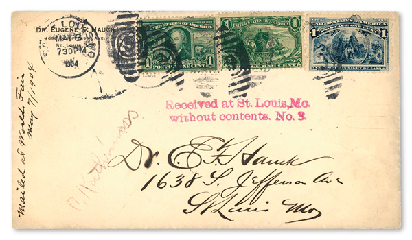 1904, Louisiana Purchase & Columbians on Cover with "Received Without Contents" (Scott 230, 285, 323), sent from St. Louis,