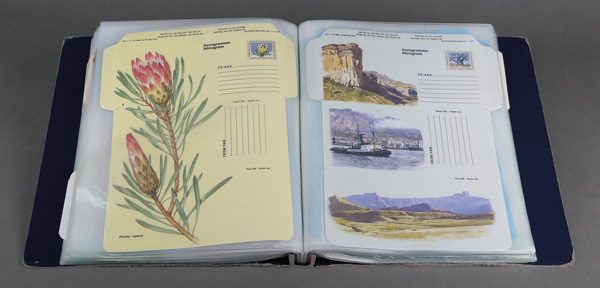 5638   imageSouth Africa, "Air Supply" Unrivaled Aerogram Holding, 1969-92, A mint sheet folder with a couple hundred unused and unfolded aerograms including some specimens, cancelled overprints and over 100 blank proofs from the 1990s, Very Fine, video flip viewable online, ex- Mannenkenpis Holding. Shipping charges apply - weight 7 lbs. (Video for this lot) (Image) Suggested Bid $225