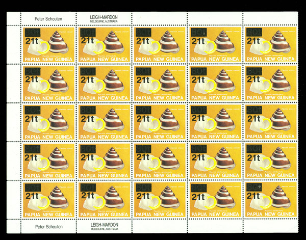 5630   imagePapua New Guinea, Overprinted Bird Issue, 1994, complete mint never hinged sheet of 50 stamps, 21t on 80t Michel #718 (cat. value €70 per stamp, or &€3500 for a complete sheet); scarce stamp, fully imaged online; unavailable for in-person viewing. (PDF for this Lot) (Image) Suggested Bid $300