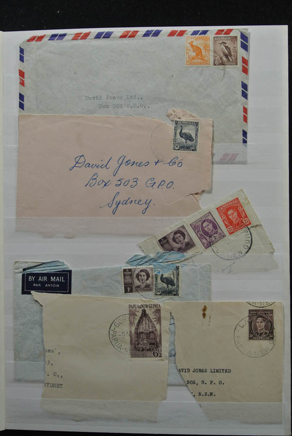 5631   imagePapua New Guinea, Stock of Used on Piece, 1952-56, stockbook with hundreds of pieces; a very nice lot for the cancel collectors, fully imaged online; unavailable for in-person viewing. (PDF for this Lot) (Image) Suggested Bid $120