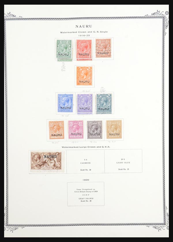 5620   imageNauru, Alluring Collection with New Hebrides, 1908-93, very well filled, mint never hinged and mint hinged stamp collection in Scott album; features (Stanley Gibbons no's): Nauru 1-11 (mint), 21, 26-36 (mint), 39 (mint never hinged), 48-56 (mint never hinged), New Hebrides 18-27 (mint), 36-39 (mint), 43-51 (mint), 52-63 (mixed condition of mint and never hinged), 68-78 (mixed condition of mint and never hinged), Postage Dues 6-10 (mint never hinged), 11-15 (mint), etc., fully imaged online; unavailable for in-person viewing. (PDF for this Lot) (Image) Suggested Bid $325