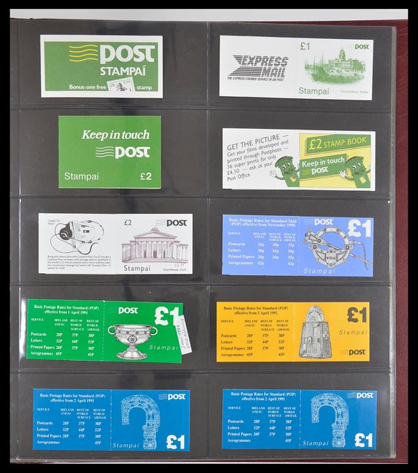5601   imageIreland, Booklets Collection, 1974-2004, nice collection mint never hinged and canceled stamp booklets in two Safe albums; features better booklets, non-value indicators, prestige booklets up to €9.50, etc., fully imaged online; unavailable for in-person viewing. (PDF for this Lot) (Image) Suggested Bid $250