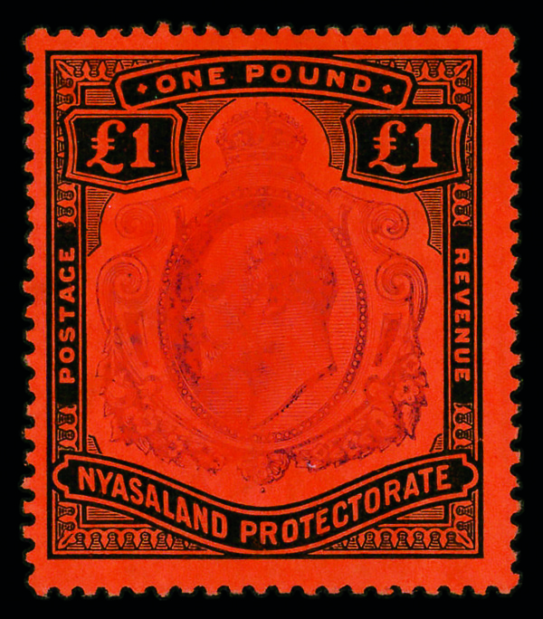 5629 og 10 image1908, King Edward VII, £1 purple & black on red (Scott 10), single, o.g., hinge remnant, Fine to Very Fine.