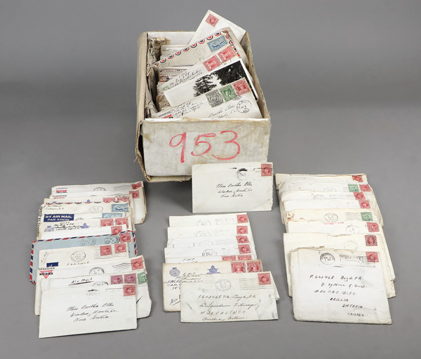 5676   imageCanadian Provinces, WWII Letters to Sweetheart, 1942-1946, about 150 envelopes (most with letters), and a few postcards between a few Canadian soldiers and the homefront; most have Newfoundland franking and most are Airmail; condition is well-worn (loved?) as one would expect; experience WWII on a personal level, Fine. Shipping charges apply - weight 5 lbs. (Image) Suggested Bid $260