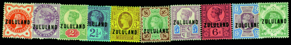 5667 og 1-10 image1888-93, "ZULULAND" on Great Britain, ½d-1s (Scott 1-10), 10 values, complete set of singles, o.g., hinge remnant; Scott 3 middle top thin/tear and Scott 10 small staintop left side., Fine to Very Fine.