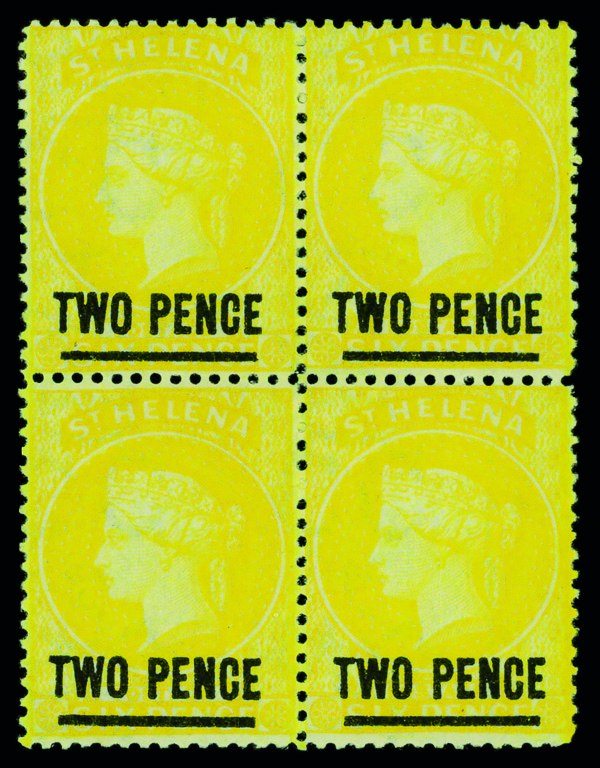 5644 ogbl 30 image1880, Queen Victoria, 2d on 6d yellow, perf. 14 (Scott 30), watermarked Crown CC, block of 4, o.g., hinged, Fine to Very Fine, All stamps are hinged.