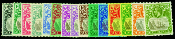 5645 og 79-93 image1922-27, King George V & Colony Badge ½d-10s (Scott 79-93), watermarked Multiple Script CA, complete set of singles, o.g., lightly hinged or hinge remnant, Fine to Very Fine.