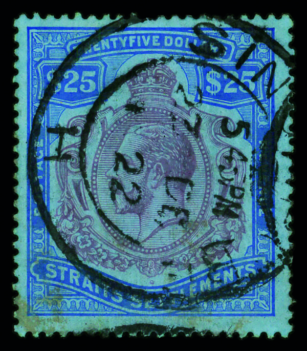 5657 O 172 image1912, King George V, $25 purple & blue on blue (Scott 172), watermarked Multiple Crown CA, single, Fine to Very Fine, CDS 27 December 1922 Singapore.
