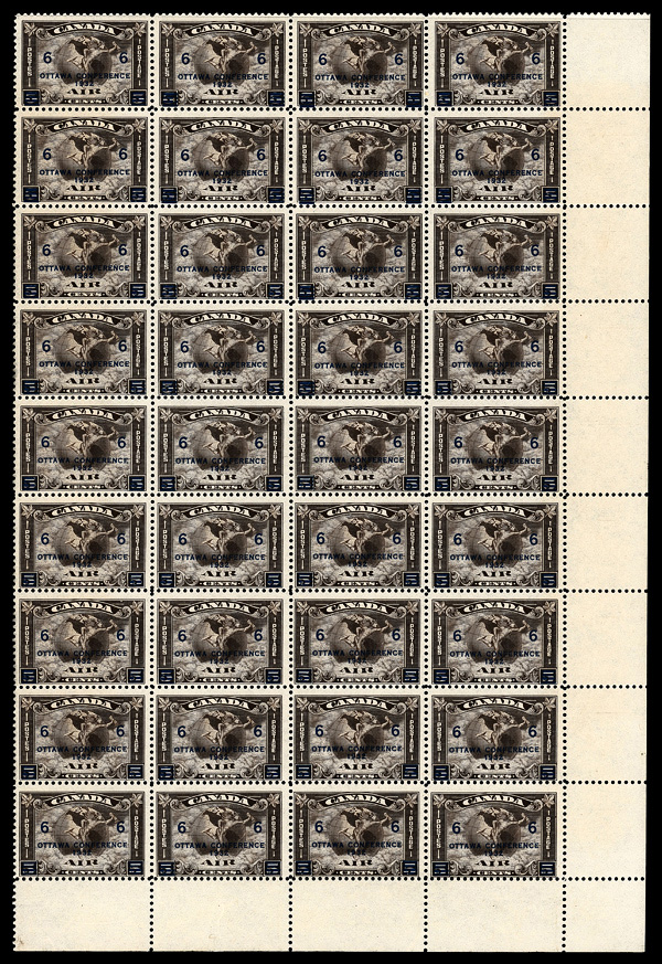 5757 nhbl C4 imageAirmail, 1932, Ottawa Conference, 6¢ on 5¢ olive brown (Scott C4), block of 36, o.g., never hinged, Fine.