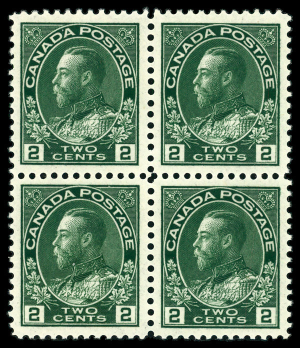 5725 nh 107e image1923, King George V "Admiral", 2¢ green, dry printing (Scott 107e), stunning block of four with each of the singles precisely centered within well-balanced margins, vivid color, o.g., never hinged, Extremely Fine and attractive multiple.