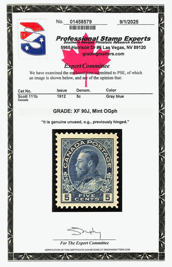 5730 og 111b image1912, King George V "Admiral", 5¢ gray blue (Scott 111b), impressive example of this scarcer shade featuring lovely characteristic color, large margins, o.g., lightly hinged, Very Fine, with 2025 P.S.E. certificate graded XF 90J.
