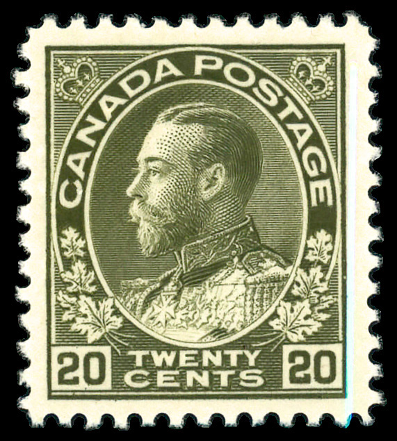 5734 nh 119 image1925, King George V "Admiral", 20¢ olive green, dry printing (Scott 119), precise centering with unusually wide balanced margins, lovely color and strong impression, o.g., never hinged, Extremely Fine, a P.O. fresh gem.