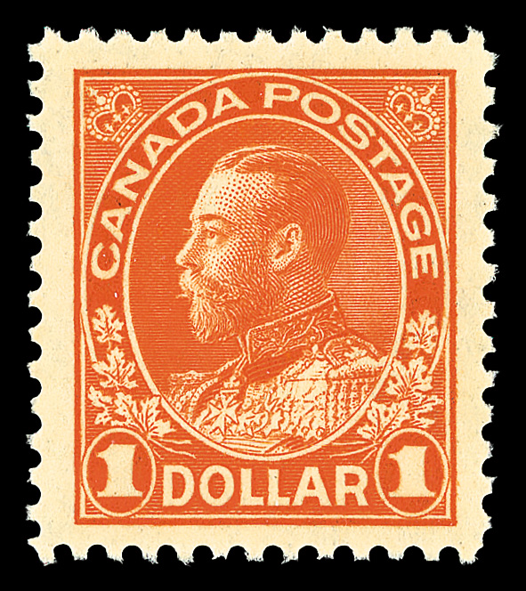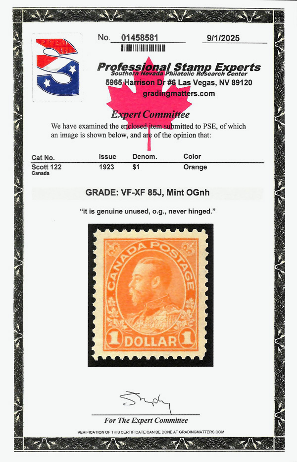 5736 nh 122 image1923, King George V "Admiral", $1 orange, dry printing (Scott 122), particularly well-centered within oversized margins, bright color, o.g., never hinged, Extremely Fine example of the high value, with 2025 P.S.E. certificate graded VF-XF 85J.