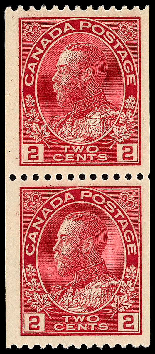 5741 nh 132 image1915, King George V "Admiral", 2¢ carmine, vertical coil, perf. 12 horizontally (Scott 132), pair with excellent centering, P.O. fresh, o.g., never hinged, choice Very Fine.