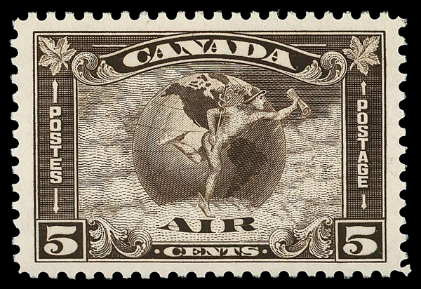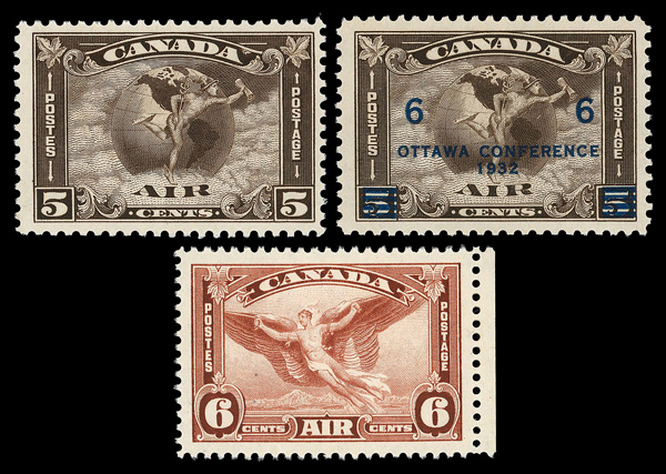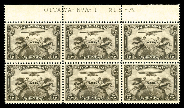 5756 nhbl C1 imageAirmail, 1928, 5¢ brown olive (Scott C1), top plate block of six with "OTTAWA -No A-1 915-A" imprint, excellent centering, P.O. fresh, o.g., never hinged, Very Fine and choice, an impressive plate block.