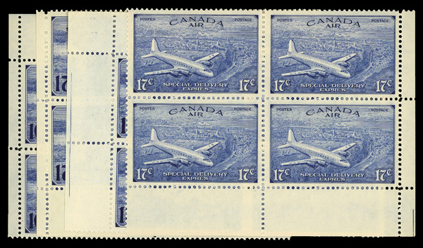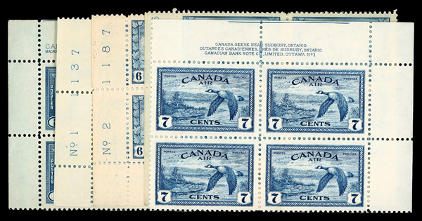 5755   imageCanada 1930/46 Airmail Issues Mint Assortment (Scott C2//C9), useful array of singles, blocks, and plate blocks featuring C2 NH (2), C4 NH, C5 yellow brown variety (Unitrade C5i), C6 plate block NH (2), C7-9 plate blocsk NH, etc., generally very well centered, fresh and VF; Scott $550+. (Image) (Image2) (Image3) (Image4) (All Images)