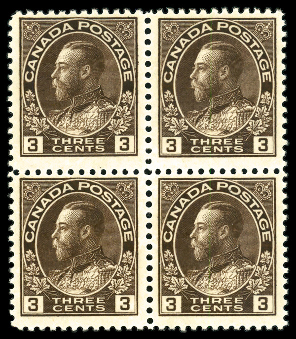 5727 og 108c image1918, King George V "Admiral", 3¢ brown, dry printing (Scott 108c), block of four, P.O. fresh, o.g., never hinged, fine to very fine.