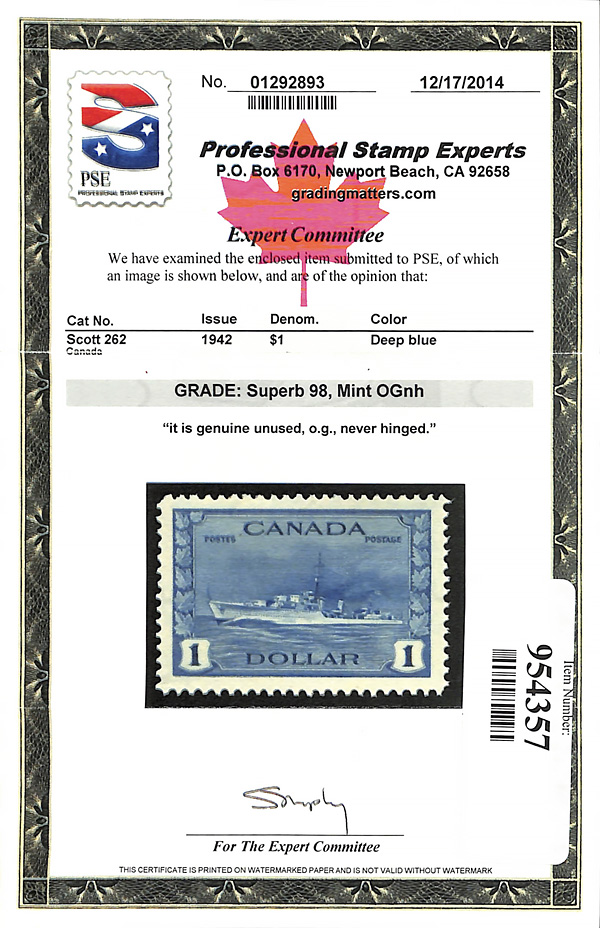 5750 nh 262 image1942, $1 Destroyer (Scott 262), o.g., never hinged, Superb, with 2014 P.S.E. certificate graded SUP 98.