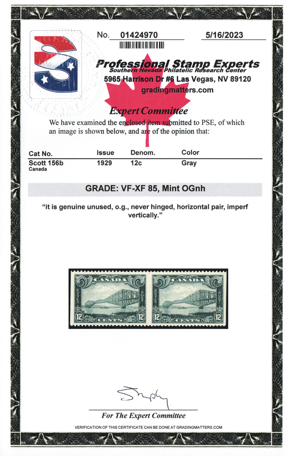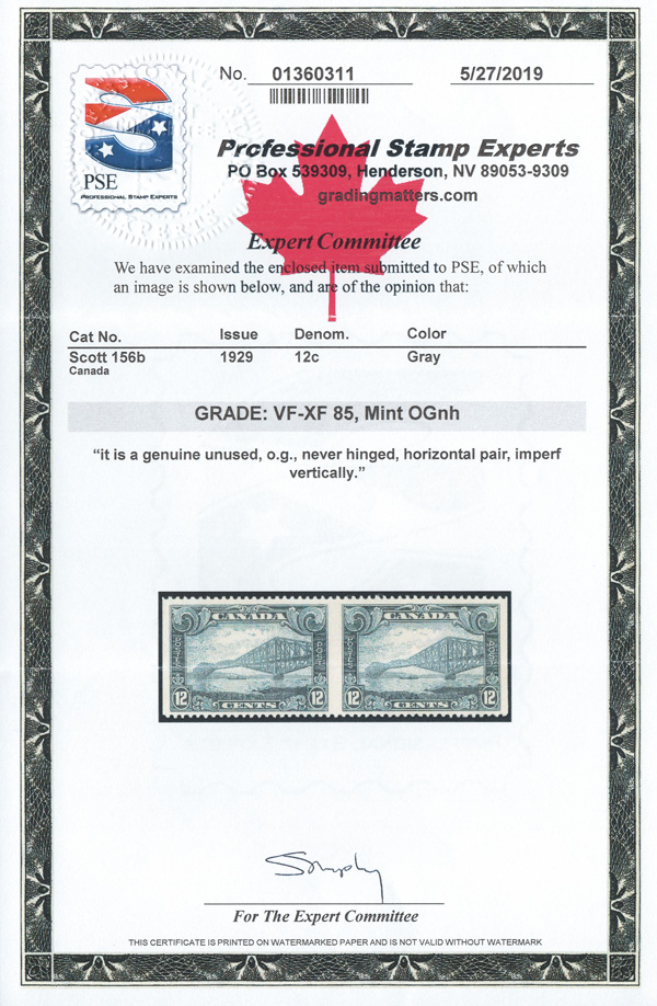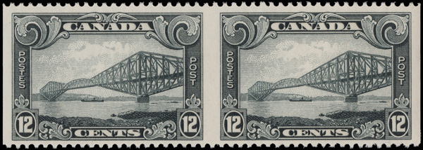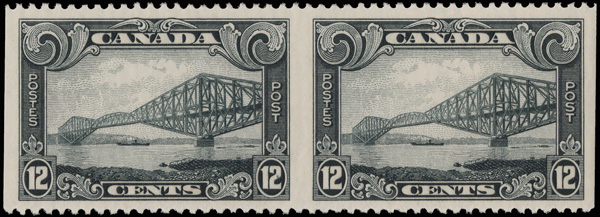 5743 nh 156b image1929, 12¢ Quebec Bridge, horizontal pair, imperf vertically (Scott 156b), o.g., never hinged, bright and fresh, Very Fine to Extremely Fine. 250 pairs are believed to exist., with a 2019 P.S.E. certificate graded VF-XF 85.